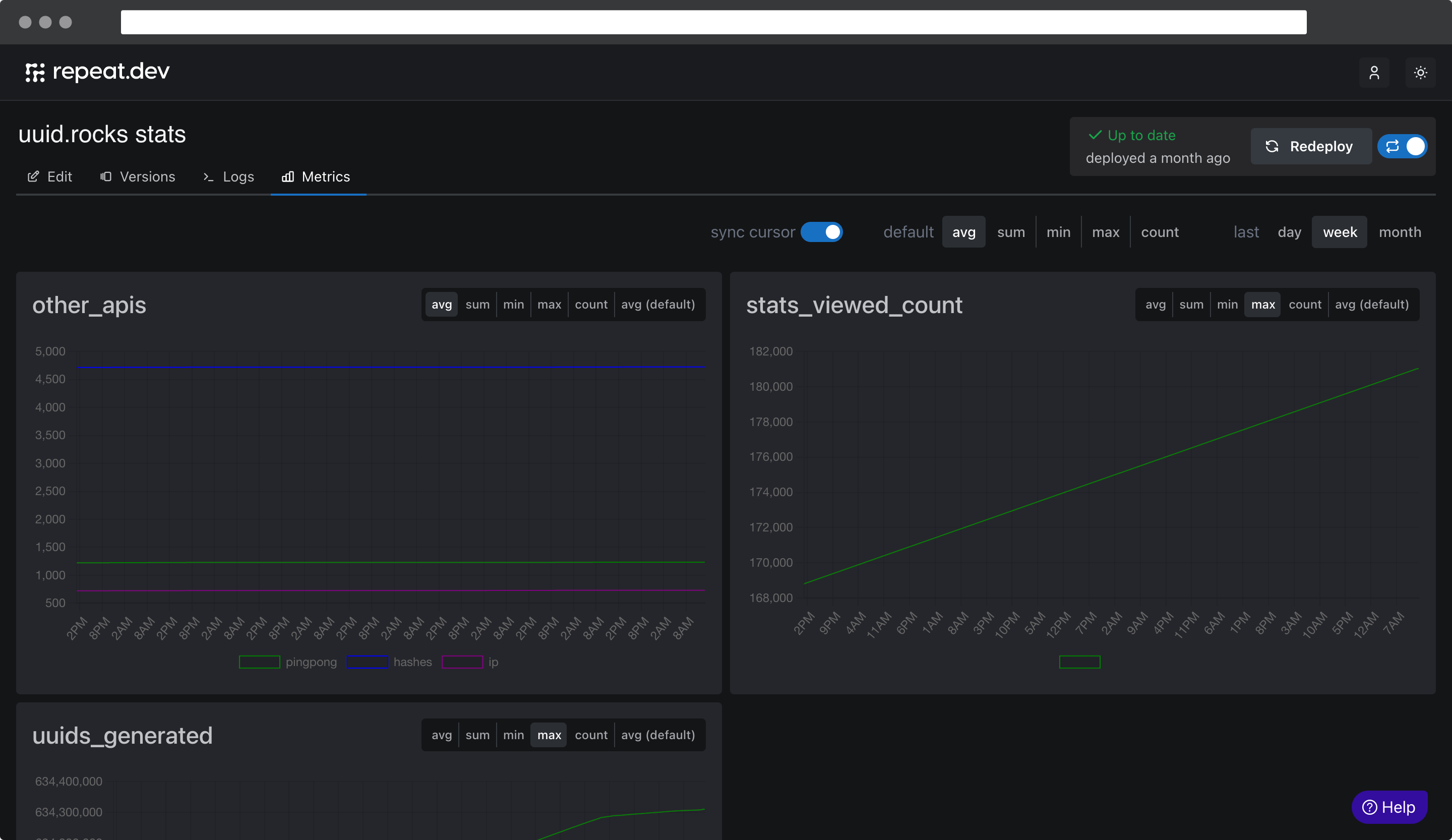 Keep track of anything, write analytics events from the repeat scripts and we will graph them in the UI automatically.